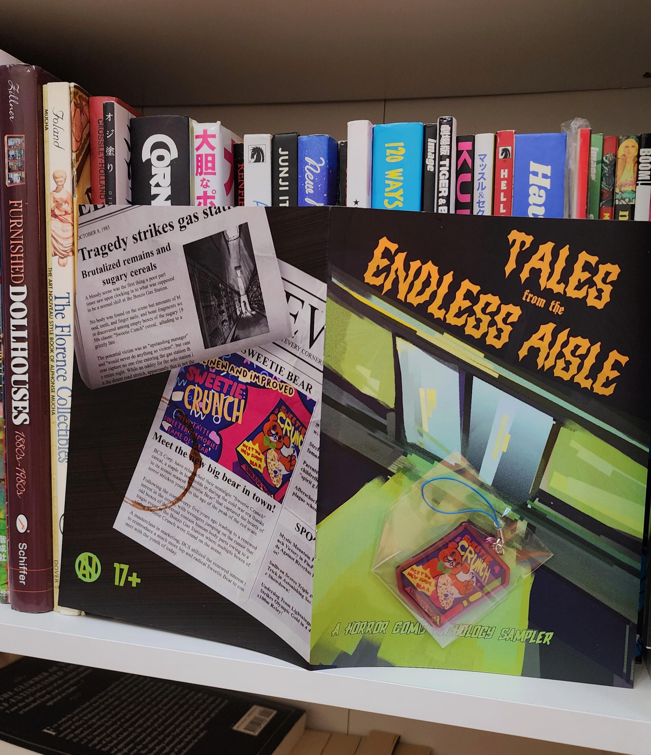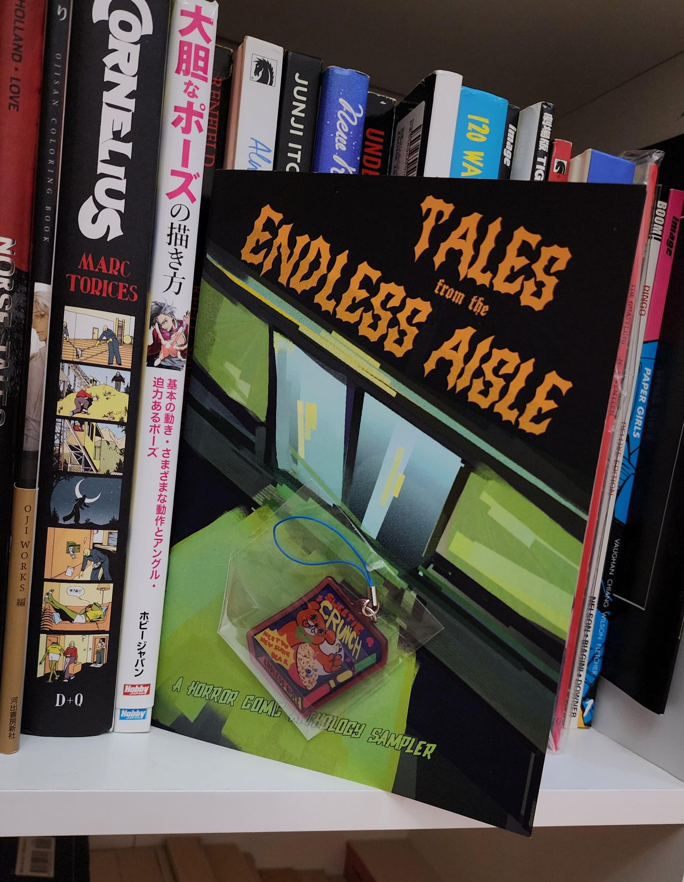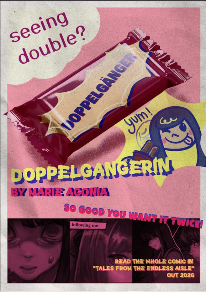 "Tales of the Endless Aisle" is an independent horror comic anthology I am responsible for. These are images of the first phase of its marketing, a horror comic that establishes the tone of the project and a keychain relating to the story. It advertises the comics by other creators that will be available in the full book.The goal is to get the word out there and begin to enter the zeitgeist, finding our audience amongst older alternative story enthusiasts by prompting news letter sign-ups and social media following.